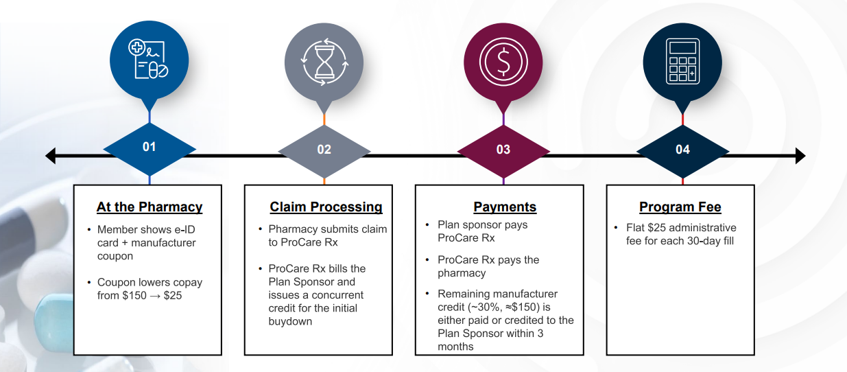 ProCare Rx’s Zepbound® Program reduces member out-of-pocket costs while maintaining full transparency for plan sponsors. Members present their digital ID and manufacturer coupon at the pharmacy, lowering their copay at the point of sale. ProCare Rx processes the claim, applies the manufacturer credit, and coordinates payment with the pharmacy. The plan sponsor receives the remaining manufacturer credit, with a simple flat administrative fee applied per fill.